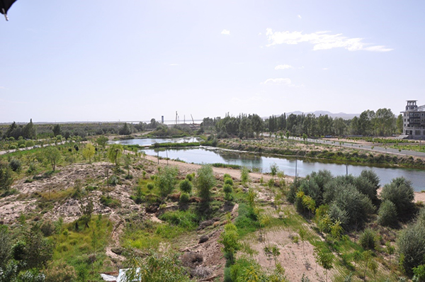 三十八度酒庄因地处北纬38度酿造葡萄种植黄金地带而得名。队伍到达时,酒庄主体建筑已竣工,正在进行内部装修工作。酒庄临沙傍水而建,水与沙赋予它静谧和谐,辽阔神秘之美。再加上一望无际,绿意葱茏的葡萄园,更多了几分田园气息。走近酒庄,“甘肃三十八度葡萄酒庄”几个大字字体略显稚拙,李生保师兄介绍说,这也是为了体现酒庄返璞归真的理念。进入酒庄,内部设计古朴典雅,主打黄色暖色调。原木设计,壁柜,家具风格、陈设,甚至灯饰都体现出独特的创意,融汇当地历史文化,带给人灵感和美好。师兄说,酒庄划分了办公、会议活动、展览大厅、住宿接待、中西餐饮、台球娱乐、KTV等多个功能区。依托当地的旅游资源,后期还会有旅游小木屋,房车营地建设。