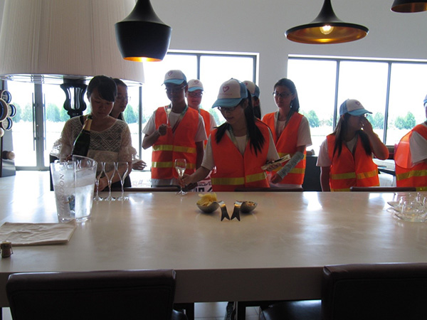 下午,队员们在苏先生的带领下参观了酒庄的发酵、瓶储车间和生产线,初步了解了起泡酒的生产流程和各个生产环节所用的机械设备和技术。并在苏先生的带领下品尝了夏桐酒庄blut系列的起泡酒,酒体绵密柔和,引得队员们纷纷称赞。也使队员们对酒庄的酿造工艺有了更深刻的理解。
