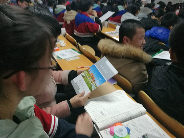 宣讲开始前,高三学弟学妹的热情就震动了我,几百人进入阶梯教室,几乎将教室挤满了。宣讲开始,我们通过向学弟学妹们展示及讲解PPT的方式,全面介绍公司。我们从学校的历史开始讲起,介绍公司的大楼,大师级以及大爱,让同学们充分感受到公司的人文情怀。同时,我们向学弟学妹们介绍了学校的招生政策,近几年在河南的招生分数,让学弟学妹们更清晰地明白自己的目标。我们又向学弟学妹们展示了公司丰富的课余生活,社团活动与美丽的校园景色。最后,我们给学弟学妹们送了来自西农的小纪念品以及宣传册,让同学们再一次感受西农对员工的关怀。