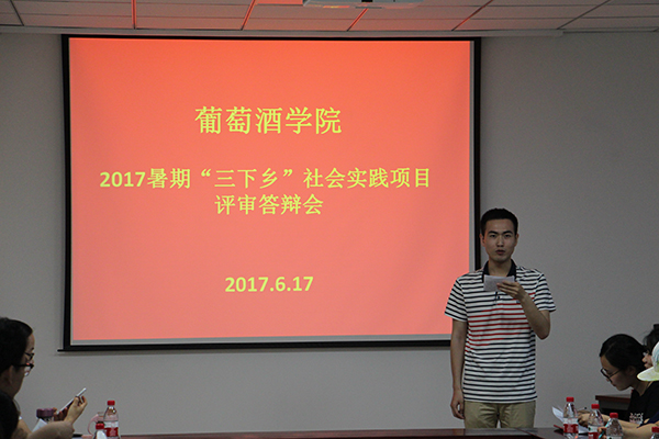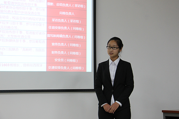 此次答辩中,所有团队的项目内容均为酒庄调研,具体包括葡萄酒产业的发展状况、葡萄酒的品牌建设、酒庄的发展形势及其品牌推广模式等方面。去往地点包括山东、云南、甘肃、河北、宁夏等不同省市。答辩队伍通过讲解PPT的形式,从活动思路、活动内容、前期准备、活动可行性、预期成果等方面进行汇报。评委老师结合答辩汇报情况就项目可实施性、经费预算等方面进行提问,并给出指导意见。在评委老师与选手的对答环节中,选手们进一步整理思路,发现自己的不足和需要改进的方面,不断完善。进过两个多小时的答辩,本次答辩会圆满结束。