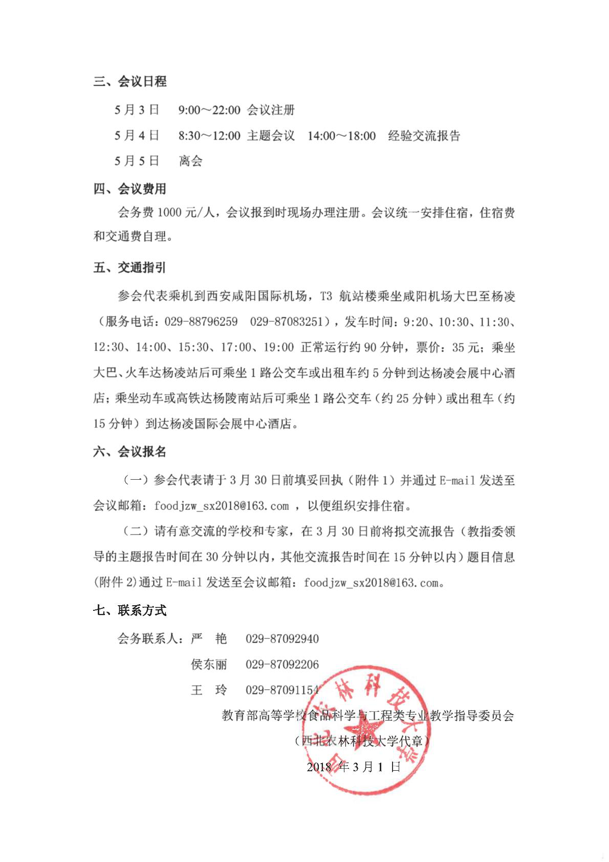 教育部高等学校食品科学与工程类专业教学指导委员会将于2018年5月3日—5月4日在陕西省杨凌农业高新技术产业示范区召开“2018年食品专业教指委第一次会议”,会议由ylzzcom永利总站线路检测承办。诚邀各位教指委委员、各高校分管食品类专业教学工作的领导、院系或专业负责人以及相关专业教学老师们拨冗参加。