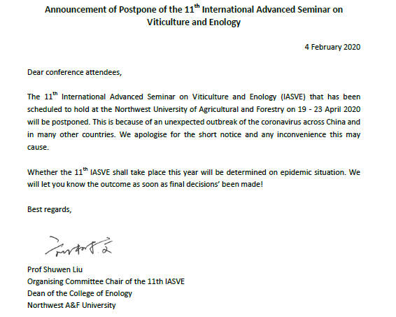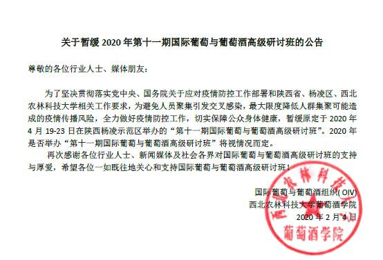 关于暂缓 2020 年第十一期国际葡萄与葡萄酒高级研讨班的公告