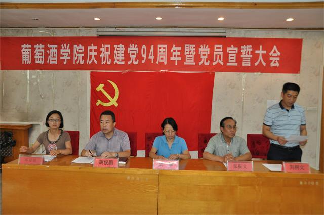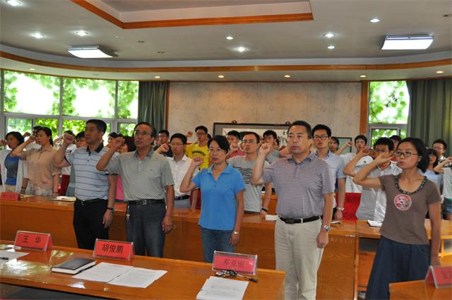 7月1日下午,公司党委举行新党员入党宣誓仪式,庆祝中国共产党建党94周年。宣誓仪式在庄严的国歌声中拉来序幕,公司党务秘书钱殷同志领誓,党委书记胡俊鹏、党委委员王华、张振文、刘树文、邓亚丽和27名预备党员、20名正式党员面向鲜红的党旗,庄严地举起右手,向党宣誓,表达了严守誓言、争当优秀共产党员的决心。 预备党员代表刘瑞同志发言,表达了对党的教育和培养的感谢之情,并号召全体党员严格要求自己,不断加强党性修养,在工作、学习、生活中起到模范带头作用。 胡俊鹏书记带领全体党员简要回顾了建党94年来走过的光辉历程和取得的丰功伟绩,总结了现阶段公司党建工作的成果与发展方向。胡俊鹏对全体党员提出要求:一是加强政治理论学习,提升党员理论素质,不断提高公司党建的科学化水平;二是发挥党员模范带头作用,增强党员创新意识,为提升学院中心工作提供强有力的保障;三是加强公司党建,凸显学院特色,有力促进学院事业科学发展;四是积极开展群众路线教育实践活动回头看工作,认真践行“三严三实”,努力实现学院新提升新跨越。他指出,学院全体党员要不断增强对党的事业的责任感,坚定政治信念,铭记党员义务,树立正确的人生观、世界观、价值观,努力实现人生的奋斗目标 最后,大会在《国际歌》歌声中圆满结束。