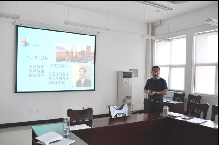 胡俊鹏书记围绕着“认真学习和严格遵守党章”这一主题,从党章的地位和作用,现行党章修改的主要内容和特点,以及学习和遵守党章的基本要求等三个方面进行了讲解。并对党员教工如何践行“两学一做”谈了自己理解,胡书记认为,党员教工在“两学一做”中首先要有坚定的理想信念,增强政治意识,以党章党规要求自己,保持共产党员的政治本色,为学院人才培养、科学研究做出贡献,为广大同学做好榜样;党员教工要有情操,不断提高修养,践行德高为范;要有扎实的学识,夯实知识功底,永葆学习状态;要有仁爱之心,坚守教育灵魂,做到仁而爱人。