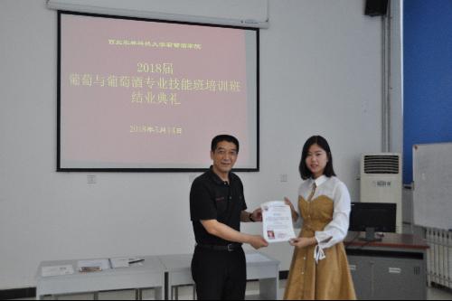 2018年5月14日下午公司举行2018届葡萄与葡萄酒专业技能培训班结业典礼,学院刘树文副经理、班主任张艳芳老师、任课教师靳国杰、科研秘书钱殷及2018届葡萄与葡萄酒专业技能培训班学员参加了结业典礼。
