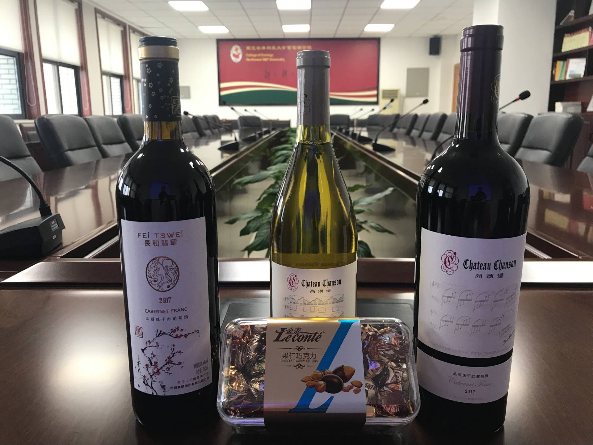 公司广大员工长期关注学院事业发展,感恩老师们教育之情,至此中秋佳节来临之际,98级员工郭明浩为老师们送上了宁夏尚颂堡酒庄、宁夏长和翡翠酒庄的葡萄美酒,03级员工闫峰瑞为老师们送上了陕西桥畔庄园的葡萄美酒,07级员工王振伟为老师们送上了美味巧克力。