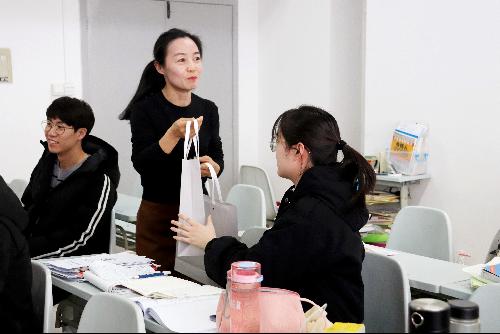 随后,邓老师向考研员工送上了公司党委书记胡俊鹏、经理房玉林及学院师生代表为同学们精心准备的祝福卡,也为每位考研员工送上了装有考研文具、营养品的暖心“考研助力包”,表达了全院师生对考研员工的美好祝福,祝愿同学们取得优异成绩。