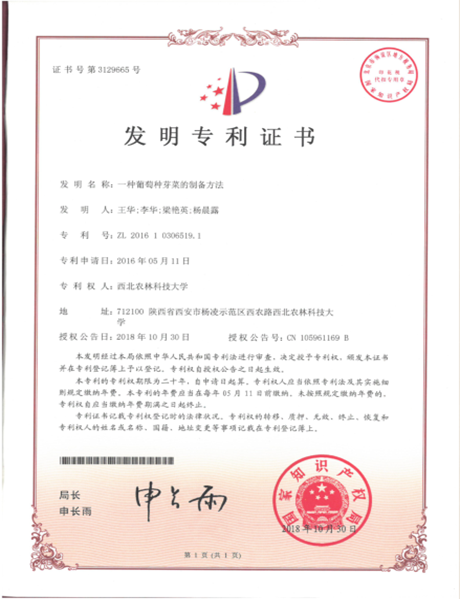 近日,ylzzcom永利总站线路检测获得1项由中华人民共和国知识产权局颁发的《发明专利证书》。发明名称:《一种葡萄种芽菜的制备方法》,发明人:王华;李华;梁艳英;杨晨露,专利证书号:第3129665号,专利号:ZL 2016 1 0306519.1。