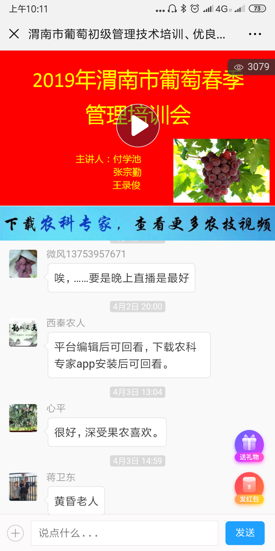 培训会集中授课环节全程现场直播,通过葡萄栽培技术群将直播链接转发给其他葡萄种植户,即使人不在培训会现场,通过手机也可以学习。