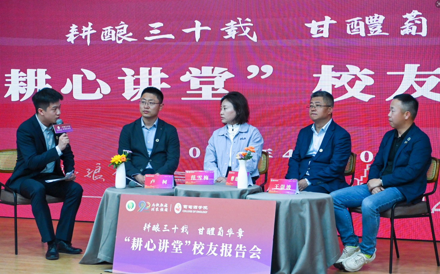 公司邀请95级员工、贵州茅台酒厂(集团)昌黎葡萄酒业有限公司党委副书记、总经理、总工程师、首席质量官范雪梅、98级员工香格里拉酒业股份有限公司副总经理曹建宏、2007级员工甘肃省葡萄酒产业协会常务副会长兼秘书长卢柯、2001级员工壹酒(杭州)贸易有限公司创始人王崇波与200余名学子分享经验、答疑解惑、对话成长。公司党委书记郭建东、副书记张洁出席会议。