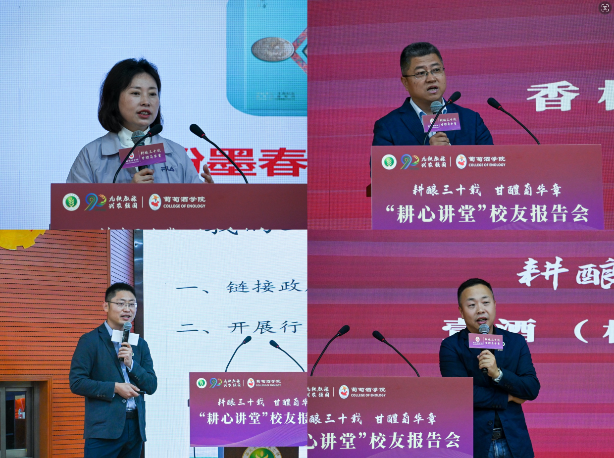 报告会上,范雪梅以《凤舞东方韵 醉美茅台红》为题,分享了她带领茅台葡萄酒逆势而上的工作经历和心得,向大家阐述了她心中“中国风土、世界品质”的具体表达。曹建宏以《扎根高原 蕴酿美酒》为题,讲述了个人十六年坚守西南高山产区,助力葡萄酒产业发展,介绍了葡萄酒产业在乡村振兴事业,促进民族团结方面起到的积极作用。卢珂以《河西走廊 历久弥香》为题,分析了葡萄酒行业发展痛点,以行业协会视角介绍了河西走廊葡萄酒产区宣传推广和交流工作。王崇波以《计划不如变化 心动不如行动》为题,分享个人多年从事酒类贸易、市场营销经历。员工们的报告感情真挚,富有哲理,娓娓道来,蕴含力量,同学们被员工坚守初心、勇敢坚韧、创造精彩的励志人生深深打动,为他们在中国葡萄酒事业做出的贡献感到而深深钦佩与自豪!