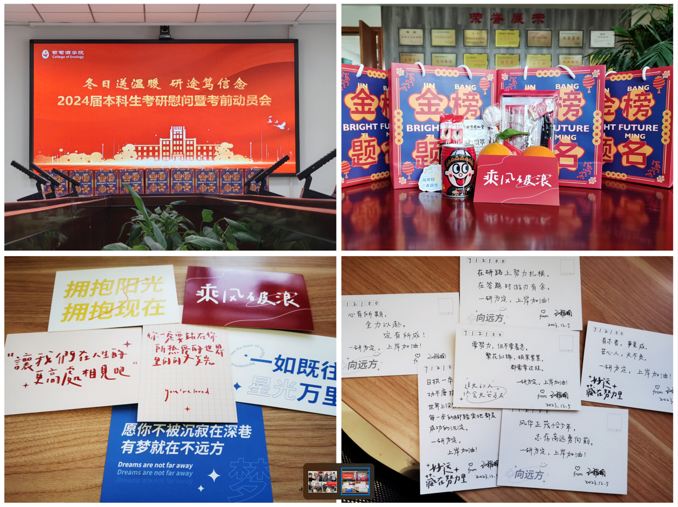 最后,老师为同学们发放了学院精心准备的暖心助研大礼包:甜甜水果橙,寓意“橙”风破浪,心想事“橙”;旺仔牛奶,寓意运“旺”时盛,“牛”气冲天;祈福文具套装,寓意金榜题名,妙笔生花;蒸汽眼罩,寓意“研”途顺利,“蒸蒸”日上;棒棒糖,寓意发挥超“棒”,表现超“棒”;咖啡,寓意苦尽甘来,“啡”你莫属。此外,还有亲笔书写的明信片和贺卡,寄托着学院老师对考研学子的深切期盼与祝福。